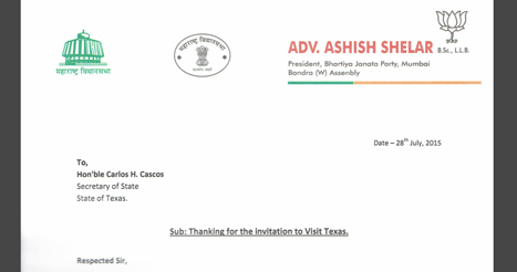 Letter from MLA Ashish Shelar for Cricket